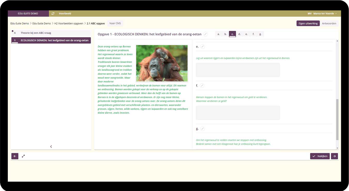 Er zijn verschillende varianten van A-B-C opgaves te maken; meerkeuze opgaves met diverse opties qua antwoordmogelijkheden, de z.g.n. gatenopgave of een openopgave met upload mogelijkheid.