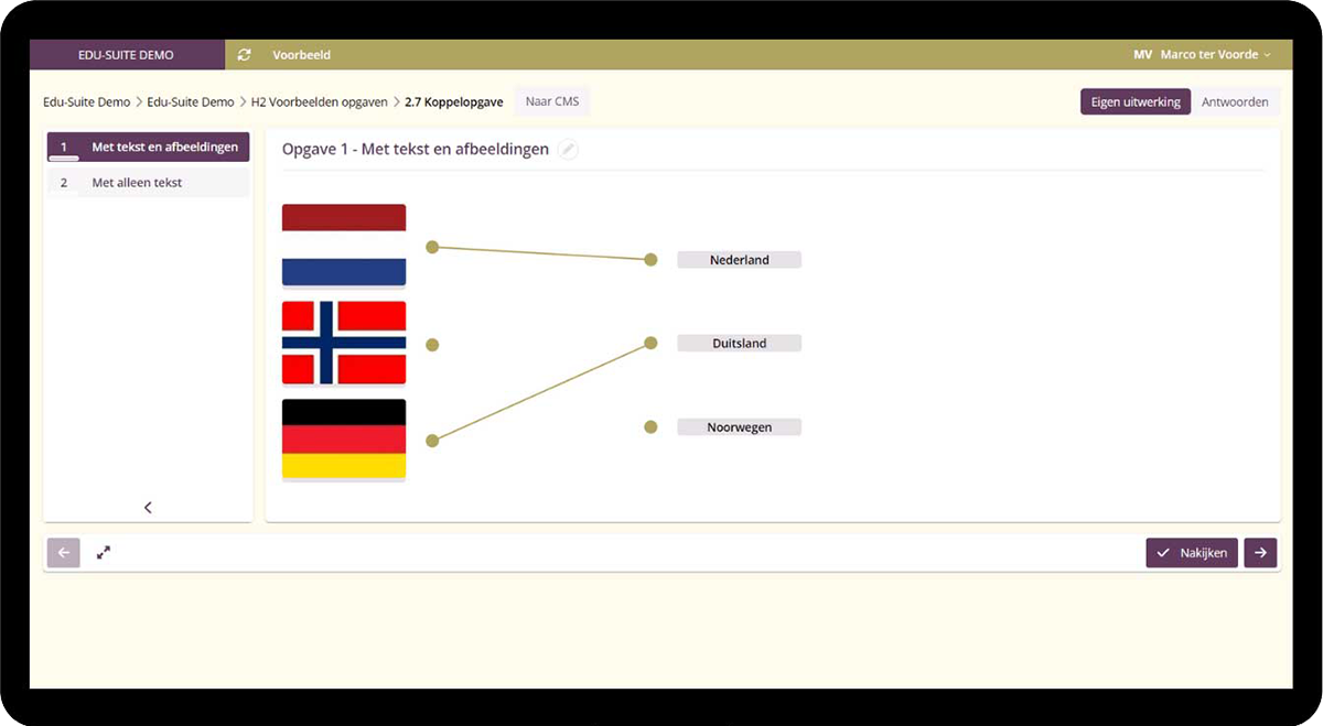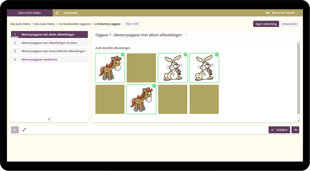 Maar ook meer interactieve opgaves zoals hotspot of memory opgaves in meerdere varianten zijn beschikbaar. Allen in meerdere varianten en door elkaar in te zetten binnen het CMS van Edu-Suite. Zo beschikt de basis authoring tool van Edu-Suite over maar liefst meer dan 50 vraag en interactie vormen.