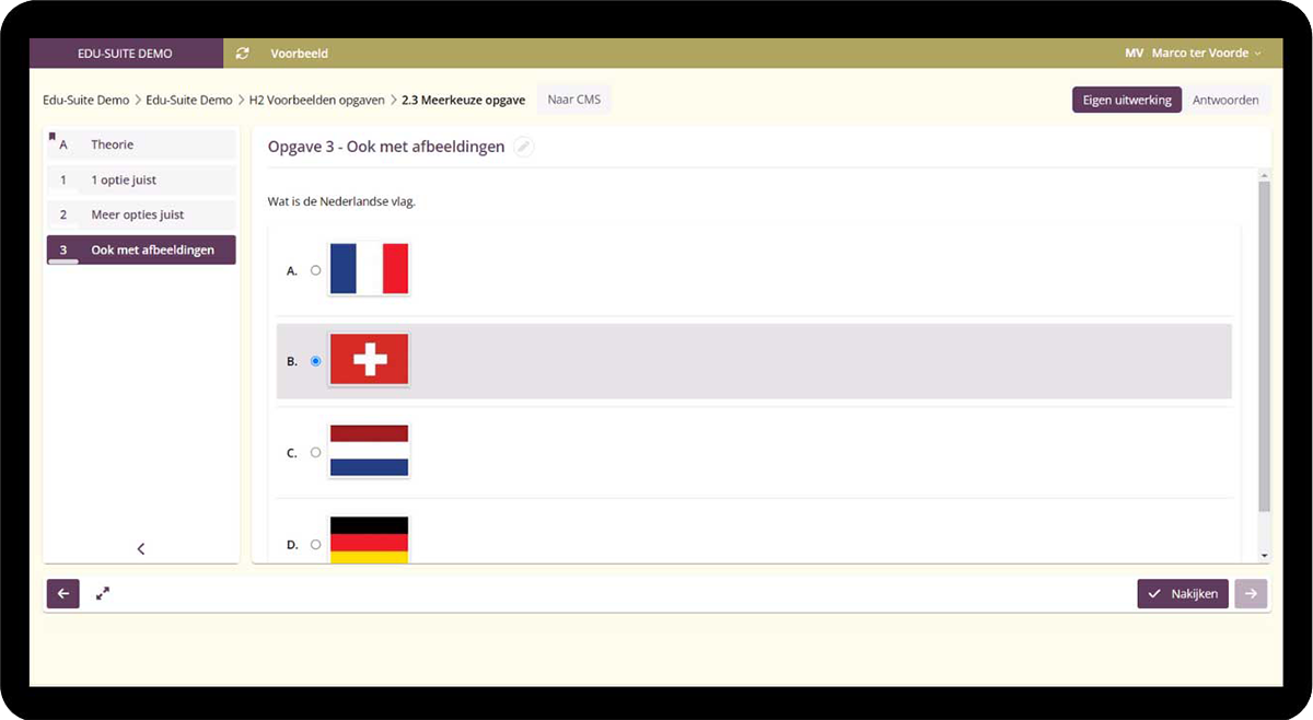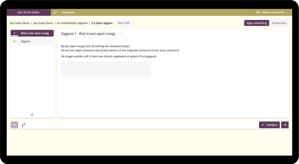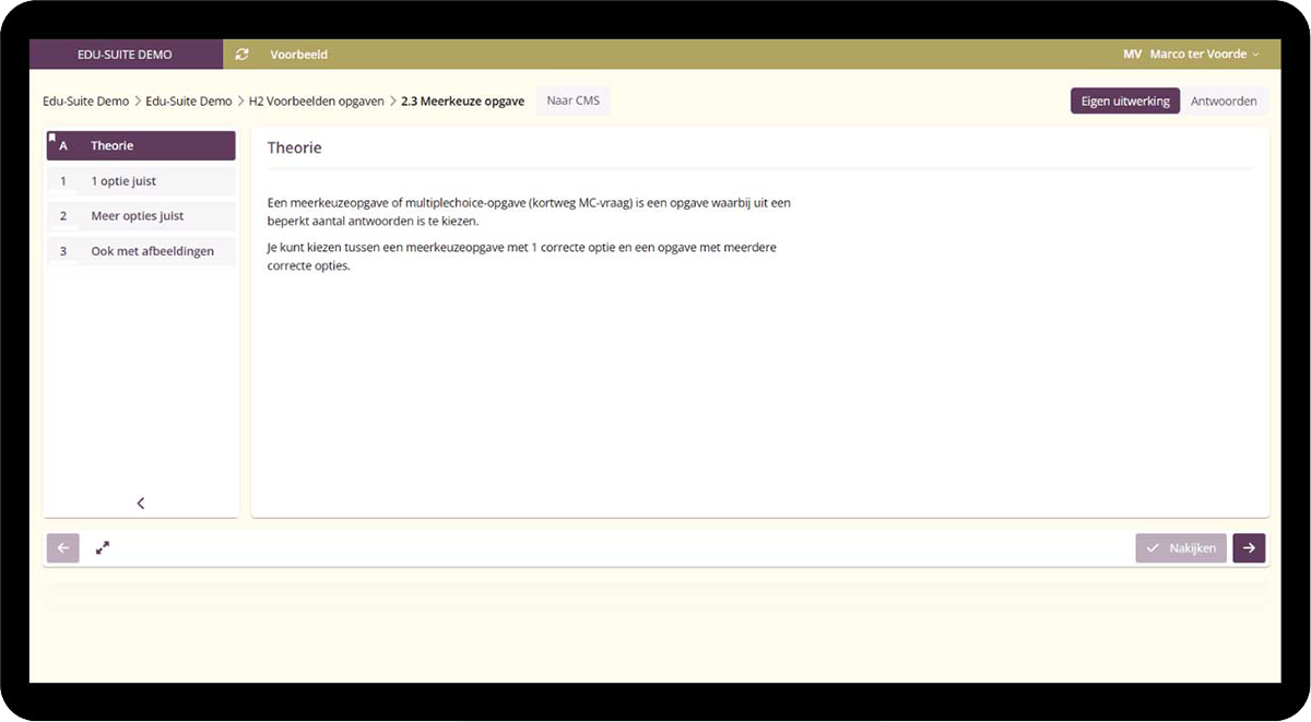 De authoring tool van het Edu-Suite CMS bevat een uitgebreide set aan vraag en interactie types. Ook het embedden van externe vraagtypes zoals H5P tooling of videoanimaties van het HiHaHo videoplatform zijn mogelijk.