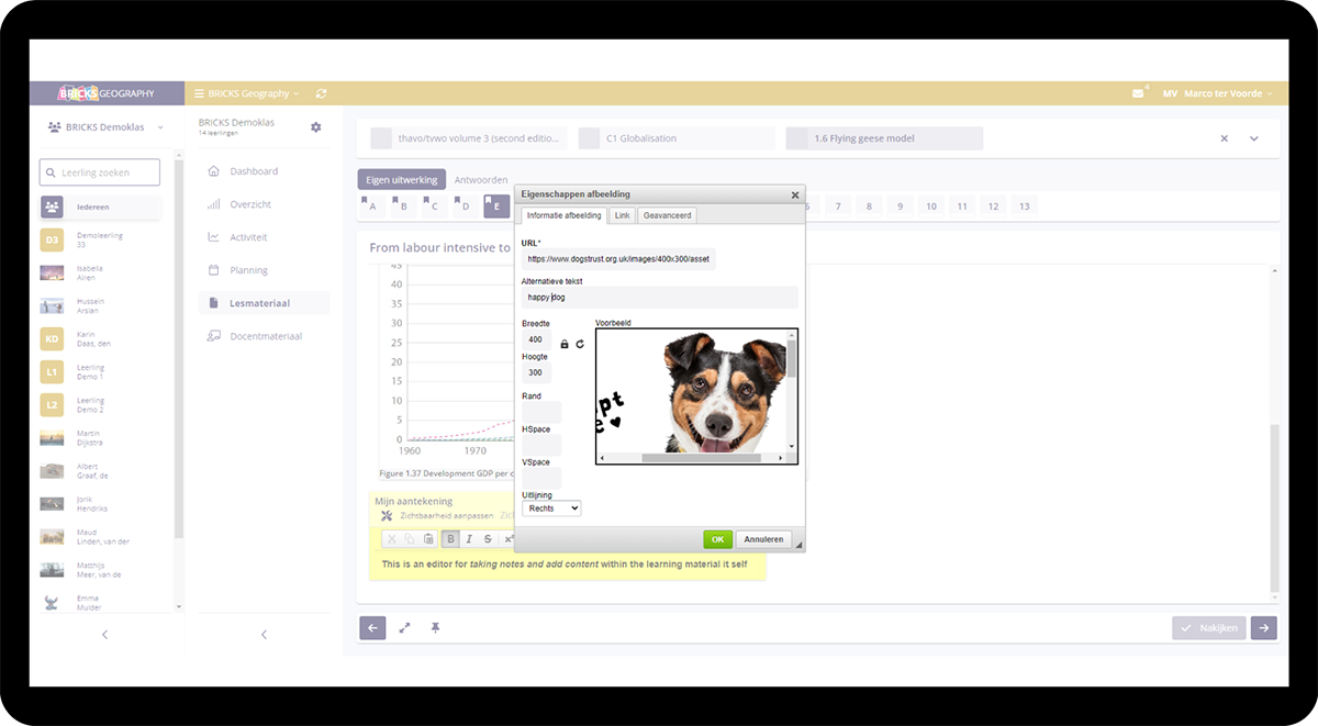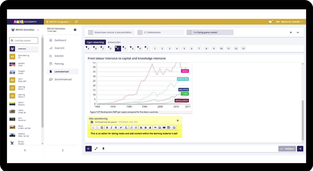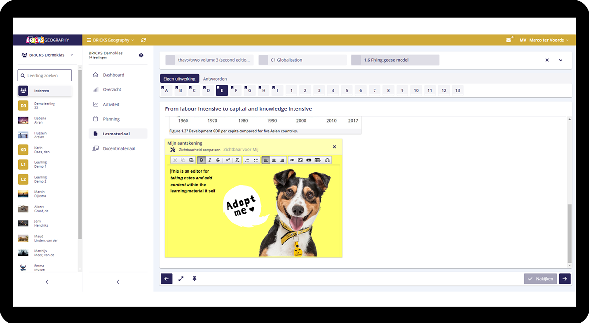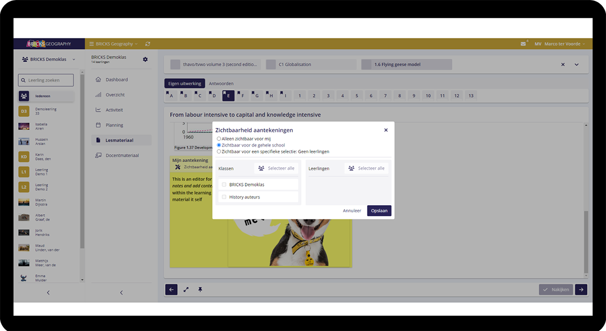 Hieronder vind je enkele voorbeelden van de mogelijkheden met betrekking tot docenten lesmateriaal, voorbeeldopgaven en de optie om notities toe te voegen aan het lesmateriaal.